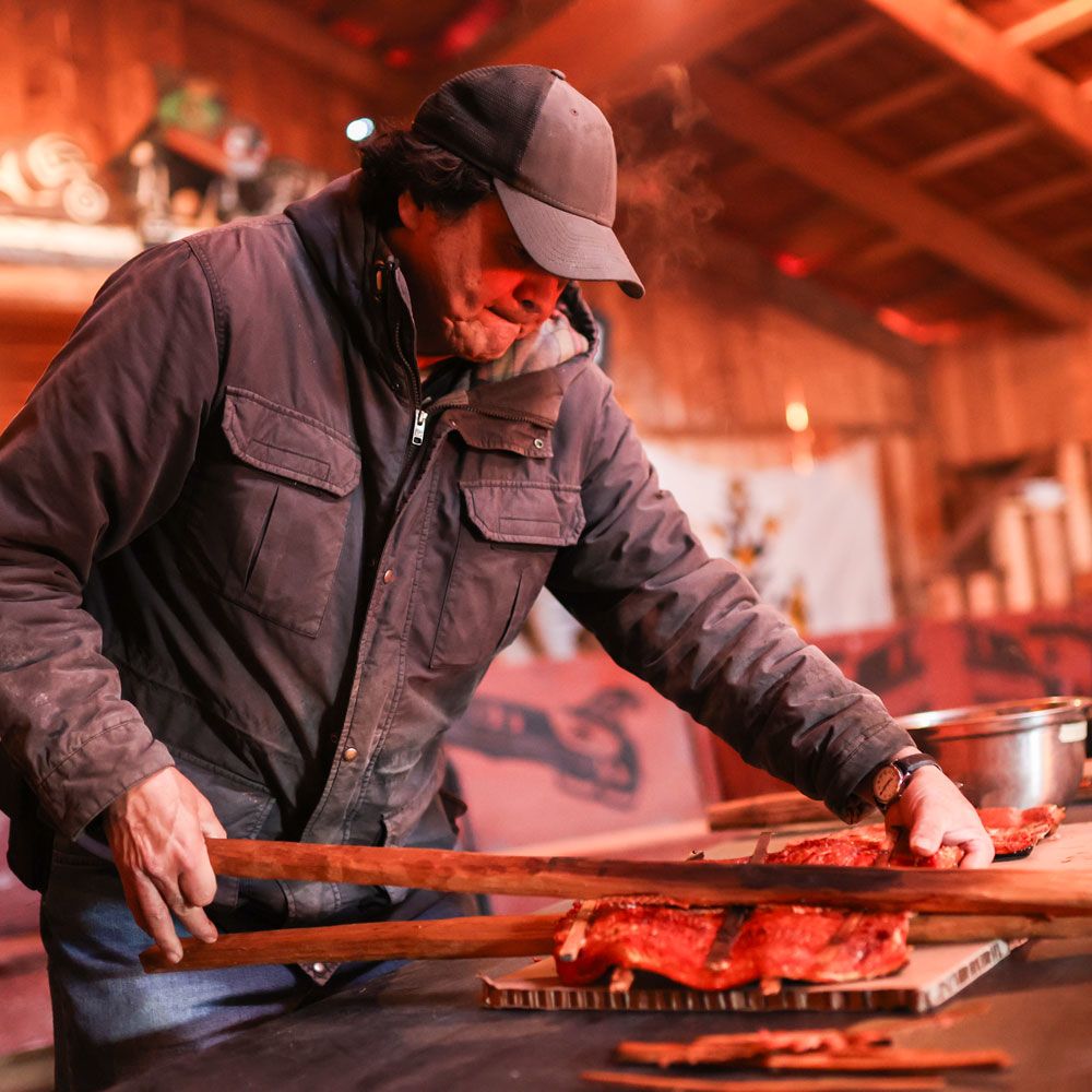 William “Dory” Johnson prepares to serve barbecued salmon cooked the traditional way over a fire for a community lunch in the Gwa’yas’dums Big House on Gilford Island in British Columbia’s Broughton Archipelago. Credit: Jesse Winter.