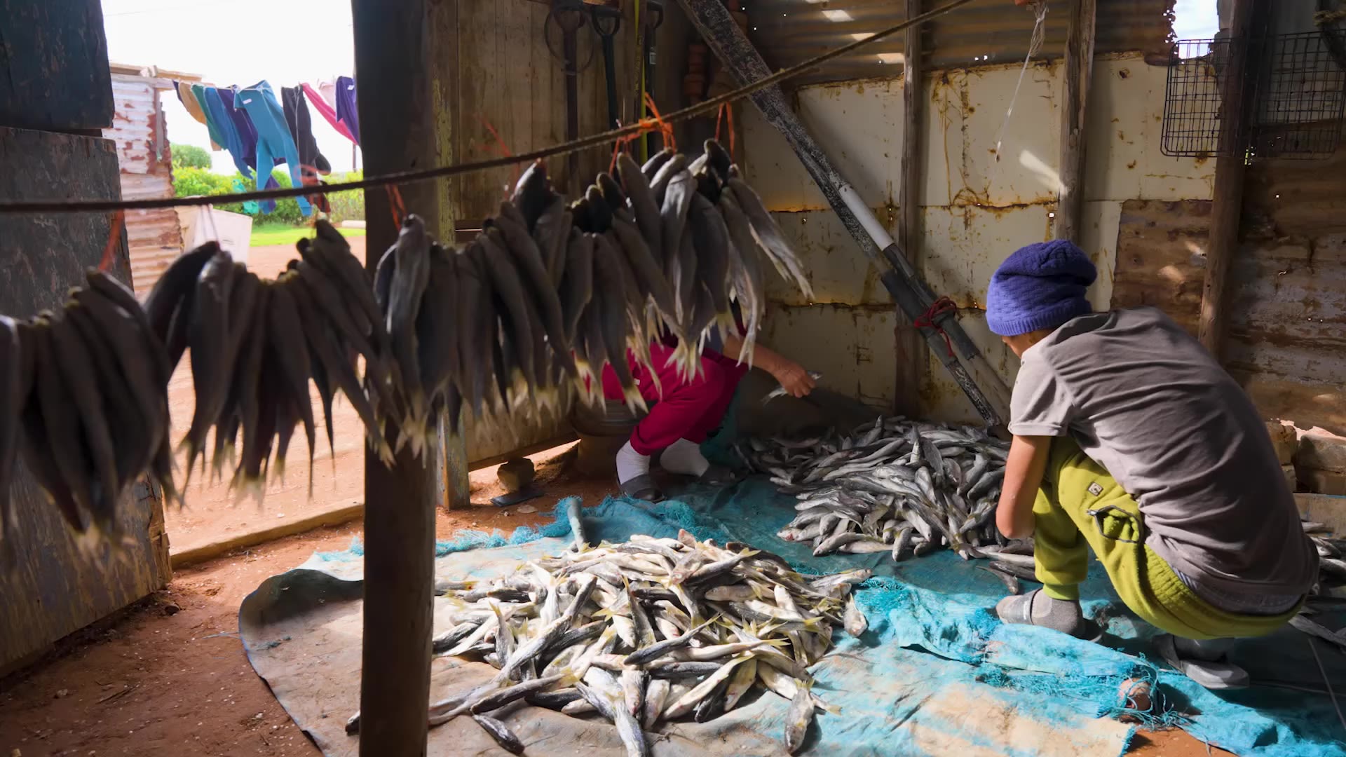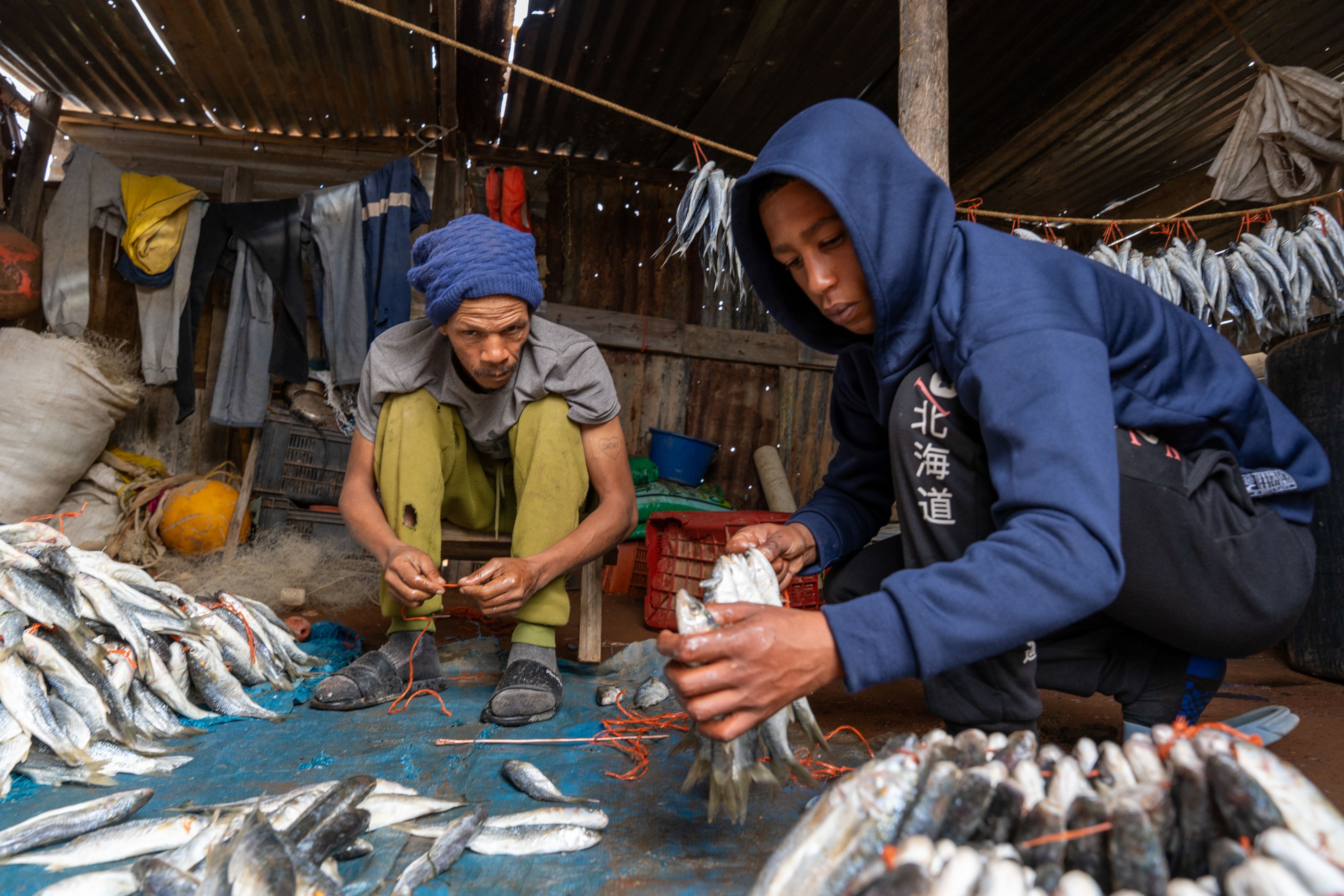 Fishers sort and prepare their catch in a small processing hut. Photo: Barry Christianson.