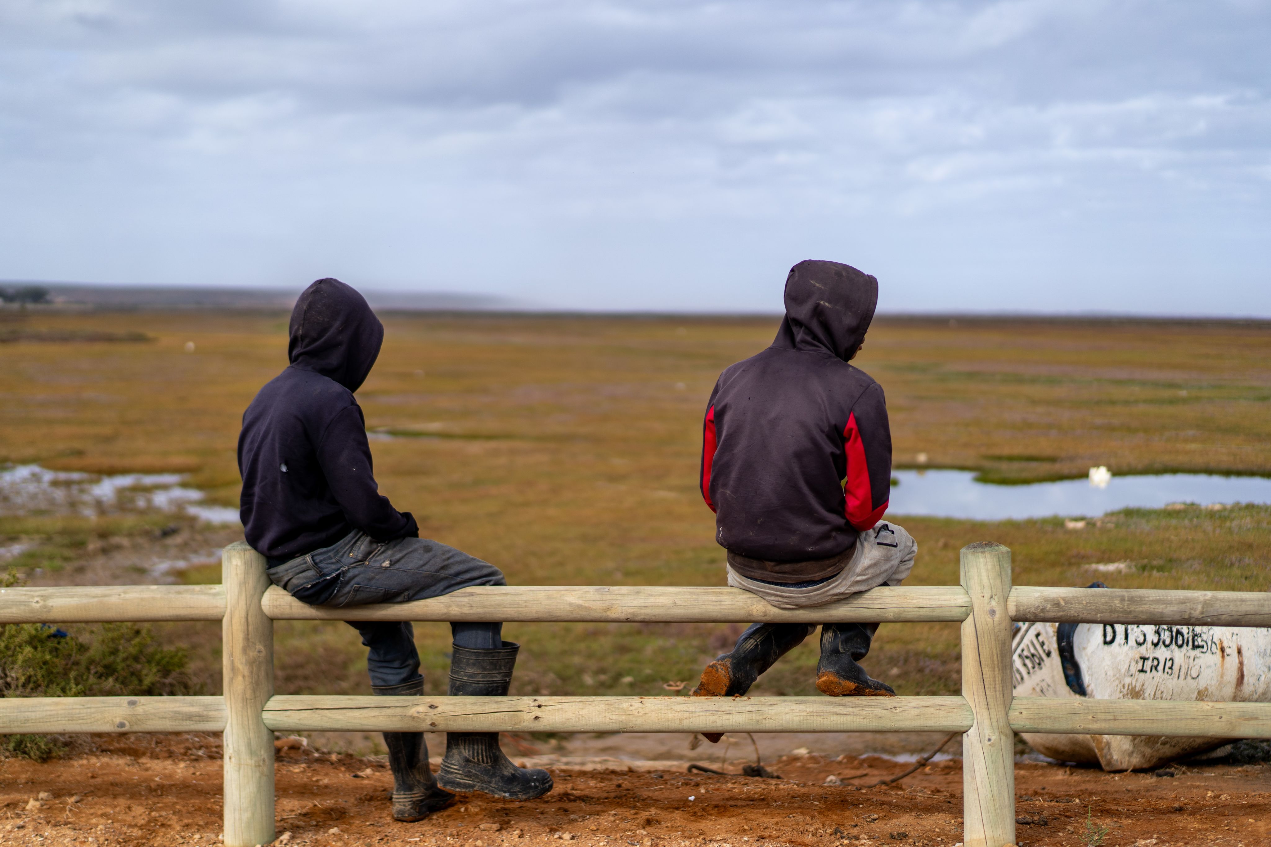 Two young men sit overlooking the wetlands near the Olifants River mouth, a landscape central to local small-scale fishing communities. Photo: Barry Christianson.