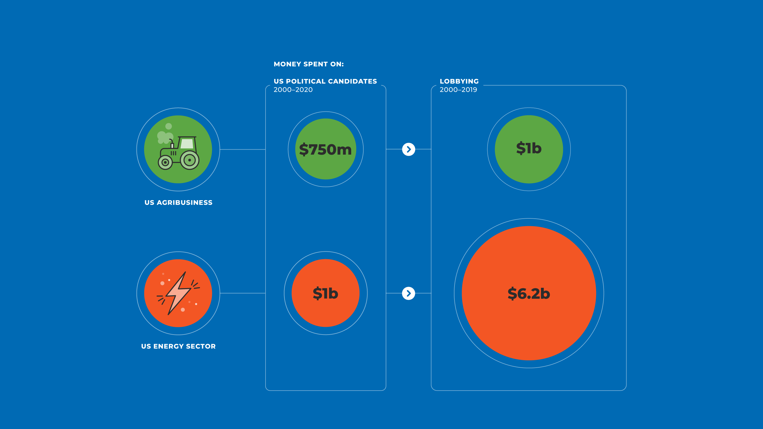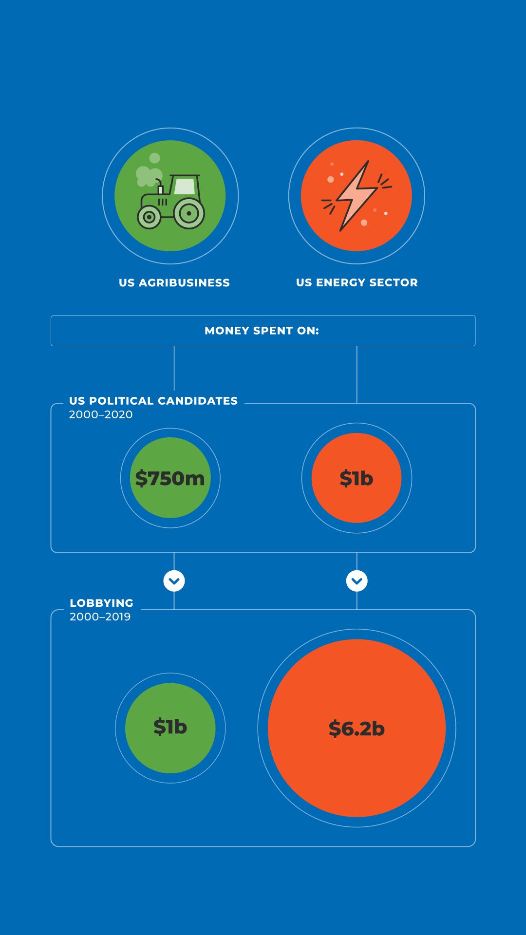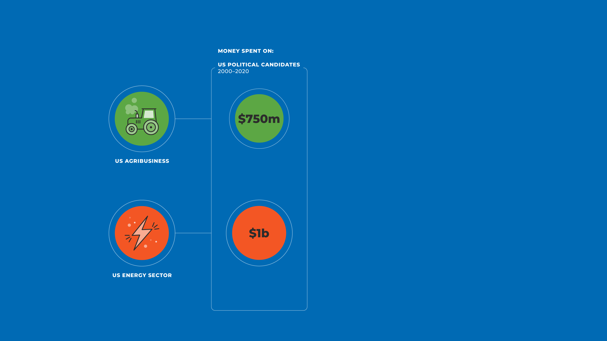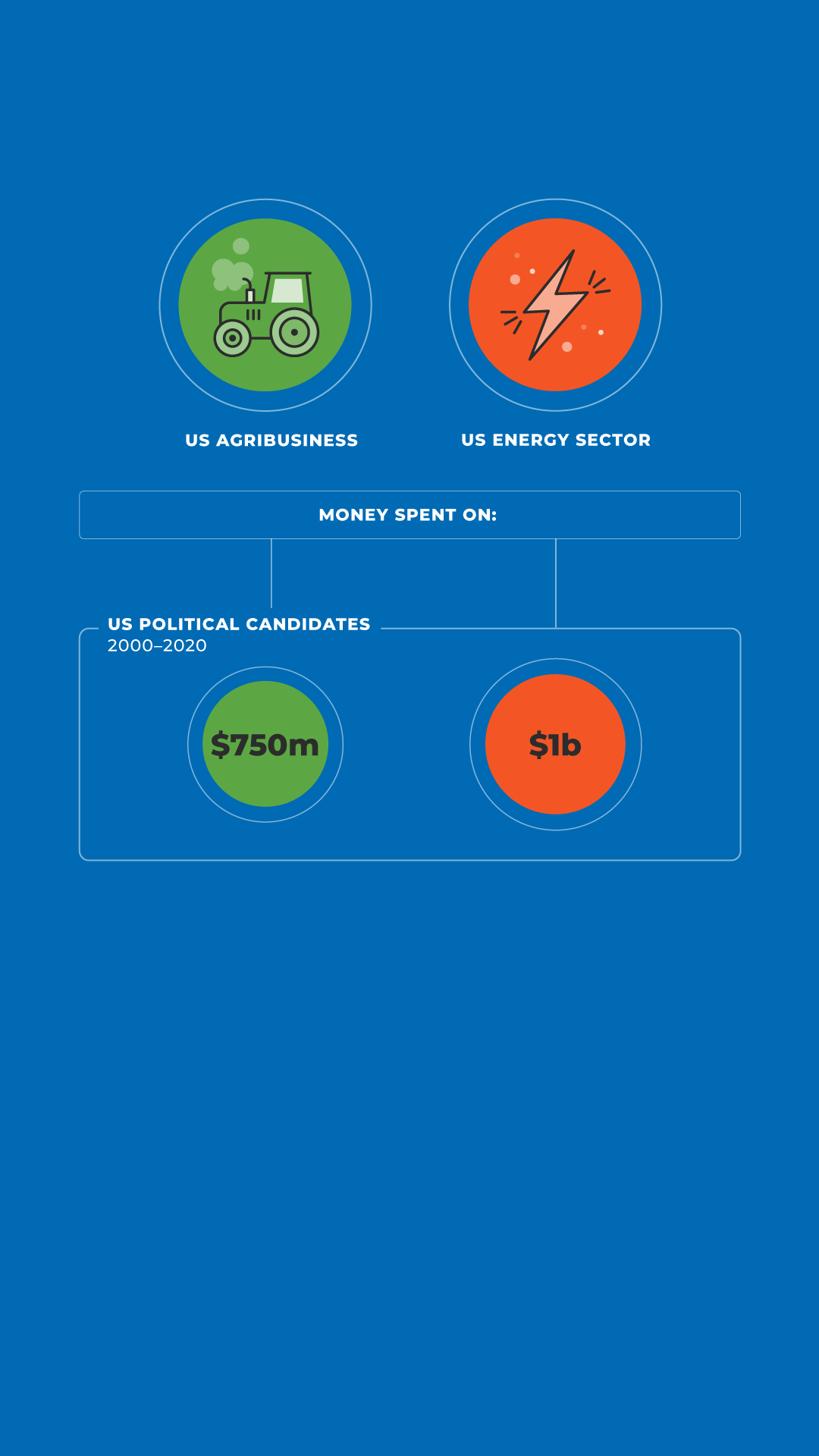 Many agri-food sectors are dominated by four to six firms with vested interests in maintaining the status quo of agriculture inputs and markets. These companies possess a vested interest in promoting and perpetuating fossil fuel– and chemical-dependent, extractive industrial food systems and make significant political contributions to ensure their influence.